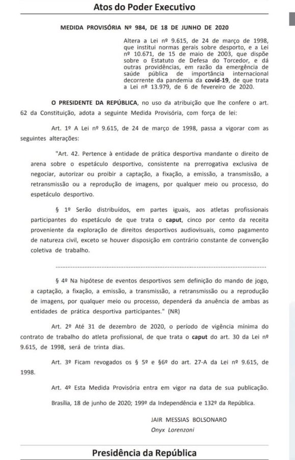 Por meio de medida provisória publicada nesta quinta-feira (18), o presidente Jair Bolsonaro promoveu modificação na lei 9.615/1998, a lei Pelé, e definiu que o time de futebol mandante tem o direito de arena sobre a partida de futebol.