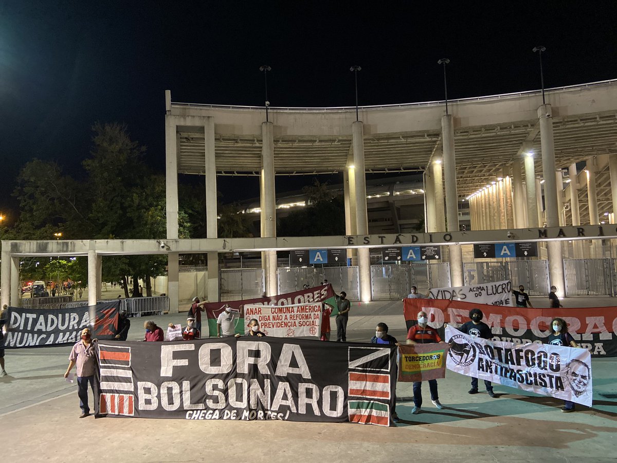 Movimento de torcedores pela democracia protesta em frente ao Maracanã contra a volta do futebol e contra os governos federal, estadual e municipal. Há torcedores de Flamengo, Bangu, Vasco, Fluminense, Botafogo e América #trmaraca
