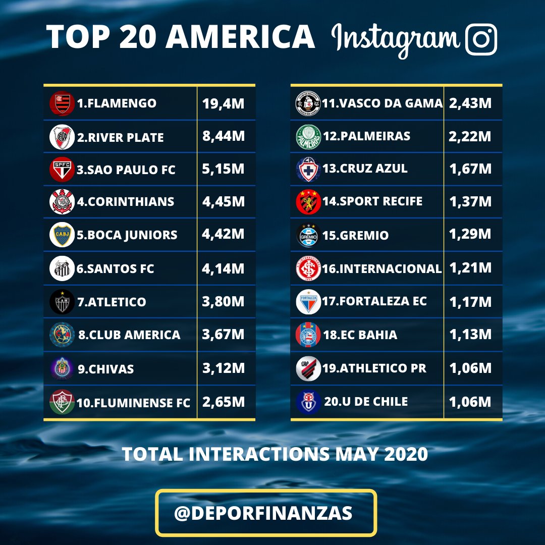 ?⚽ Los 20 clubes de América con más interacciones en #instagram durante mayo 2020. ??