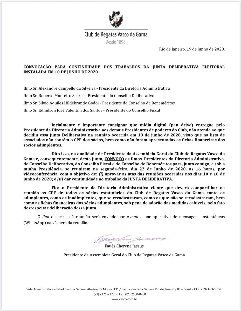 Presidente da Assembleia Geral do Vasco, Mussa convoca nova reunião da Junta Deliberativa para a próxima segunda (22) e exige que Campello apresente os dados que faltam da lista de sócios (CPF, fichas financeiras e etc) sob pena de adoção das medidas cabíveis