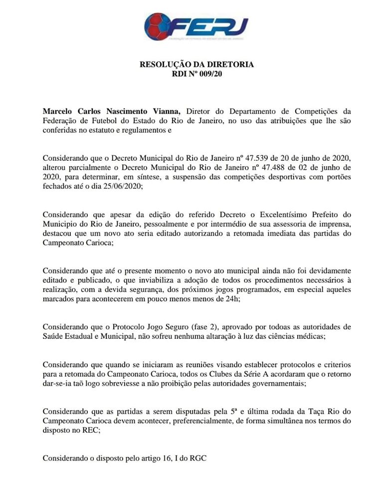 Abaixo, a RDI publicada pela Diretoria da FERJ: