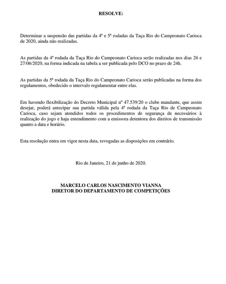 A Federação de Futebol do Estado do Rio de Janeiro informa que, seguindo o Decreto Municipal nº 47.539/20, a FERJ reprogramou os jogos restantes da 4ª rodada e 5ª rodada da Taça Rio.