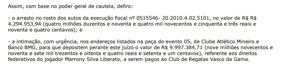 Sobre a venda de Marrony, a magistrada determinou que a penhora seja realizada no valor de R$ 9.997.384,71. Foi ordenado que o Atlético-MG e o Banco BMG depositem esse valor em juízo, com urgência, não os repassando ao Vasco. Vale lembrar que o clube presidido por Alexandre Campello já recebeu parte dos cerca de R$ 14 milhões pela venda de Marrony nos últimos dias, quitando parte dos salários atrasados com jogadores e funcionários. Caso o valor não alcance o limite da penhora, a União poderá pedir que o bloqueio seja complementado em outro crédito do Vasco.