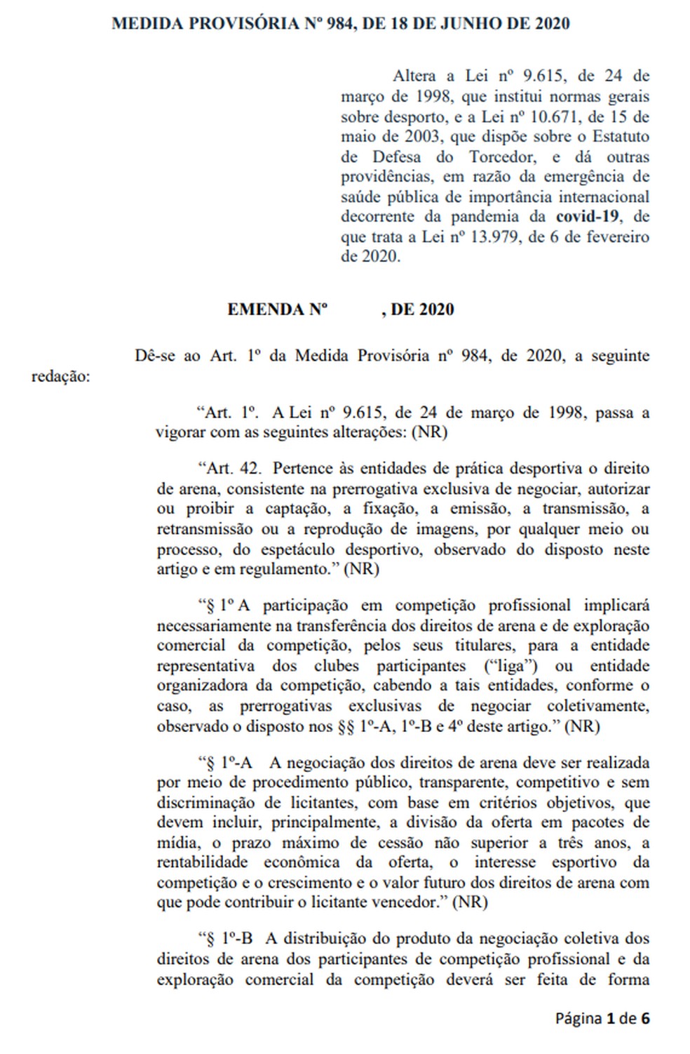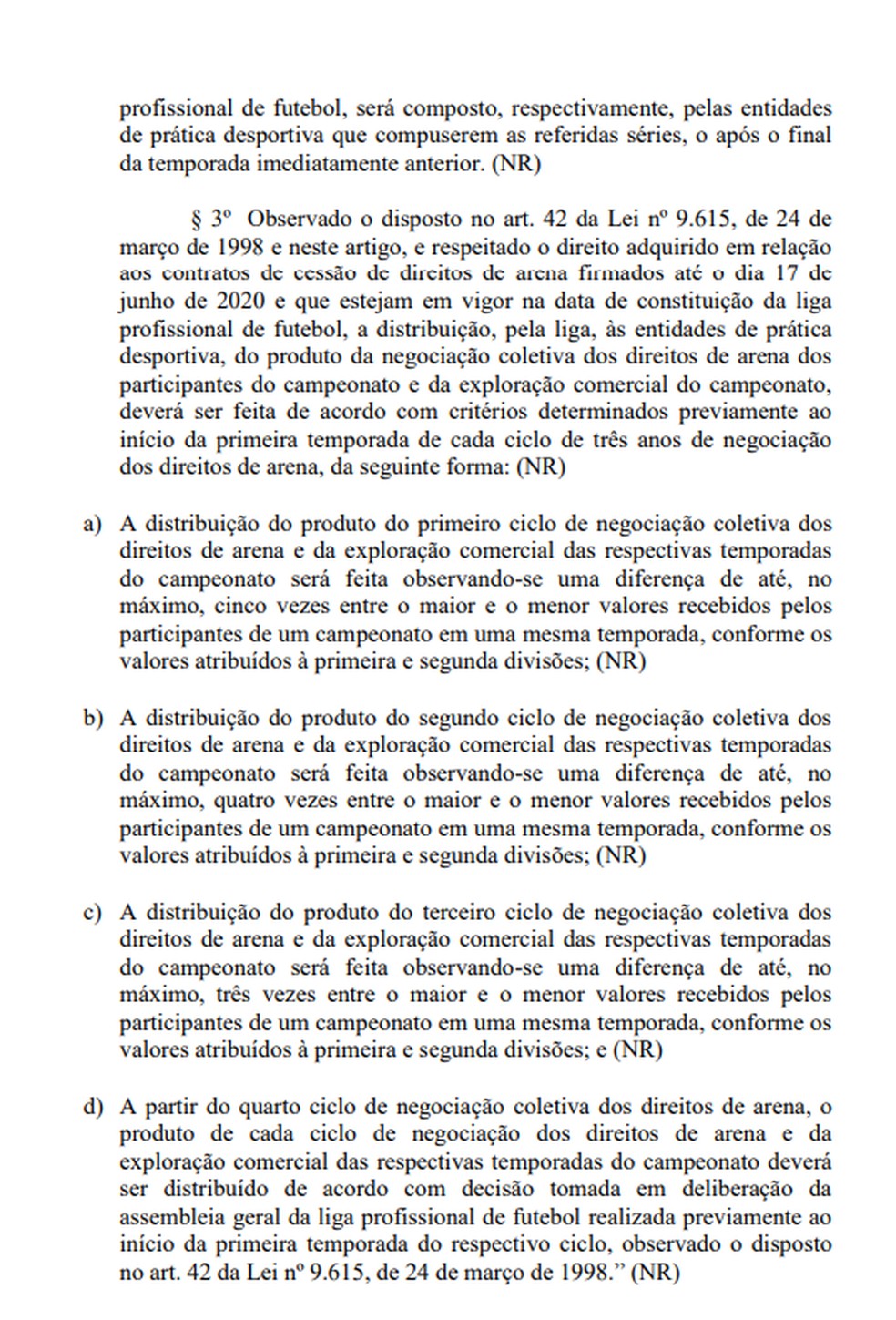 O texto, na mesma linha do que defendeu Rodrigo Maia em coletiva na última quinta-feira, propõe a criação de uma liga para as Séries A e B do Brasil. Em linhas gerais, a emenda diz que a entidade seria a responsável por negociar de forma coletiva os direitos de transmissão e exploração comercial dos campeonatos, e distribuí-los aos clubes de forma que a diferença entre o time que mais recebe e o que menos recebe não seja superior a cinco vezes.