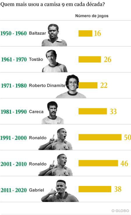 Coube ao corintiano Baltazar a honra de ser o primeiro camisa 9 da seleção brasileira, há 70 anos. Na época, estreia do Brasil na Copa do Mundo de 1950, contra o México, não se discutia a falta de um camisa 9, não se pensava estrategicamente no falso 9, e nem se sabia que a camisa entraria na história da seleção brasileira, atrás, talvez, só da 10 de Pelé. De Baltazar a Richarlison, foram 128 jogadores que a usaram, e O GLOBO traz levantamento inédito com os nomes que mais jogaram.
