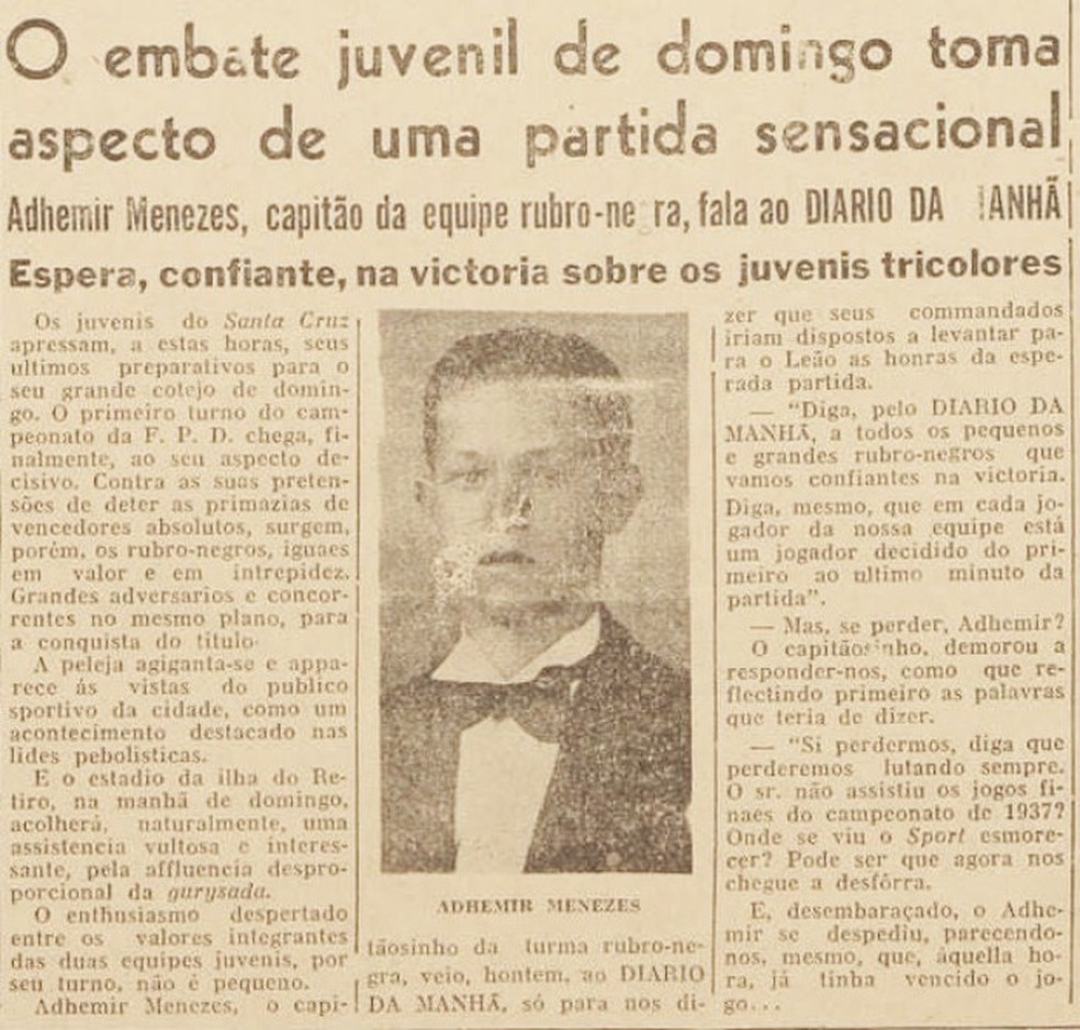 A consciência do que fazia em campo vinha atrelada a uma condição de líder. Aos 15 anos, Ademir Menezes foi capitão da equipe juvenil do Sport e conduziu o time pernambucano ao título da categoria em cima do Santa Cruz, em 1938.