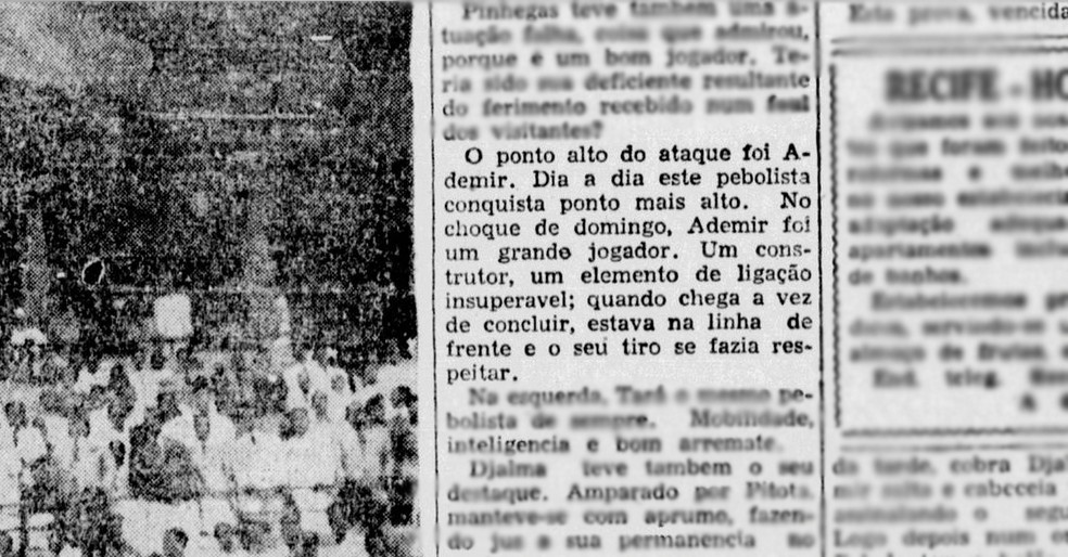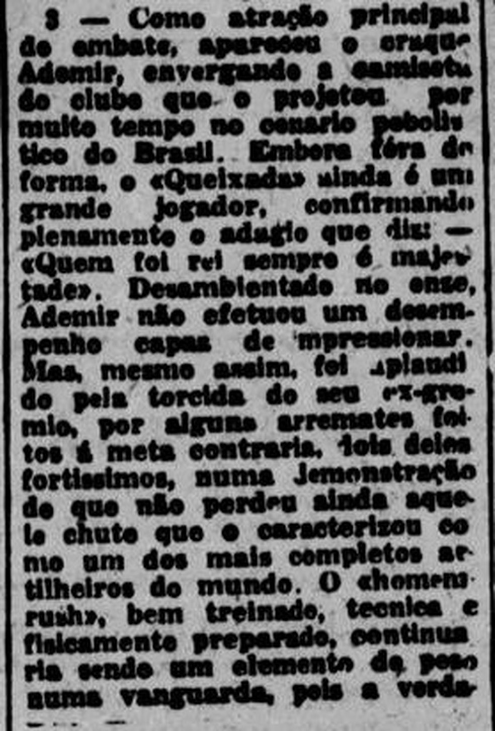 - Dia a dia este pebolista conquista ponto mais alto. No choque de domingo, Ademir foi um grande jogador. Um construtor, um elemento de ligação insuperável. Quando chega a vez de concluir, estava na linha de frente e seu tiro se fazia respeitar, publicou o Diario de Pernambuco (leia abaixo) .