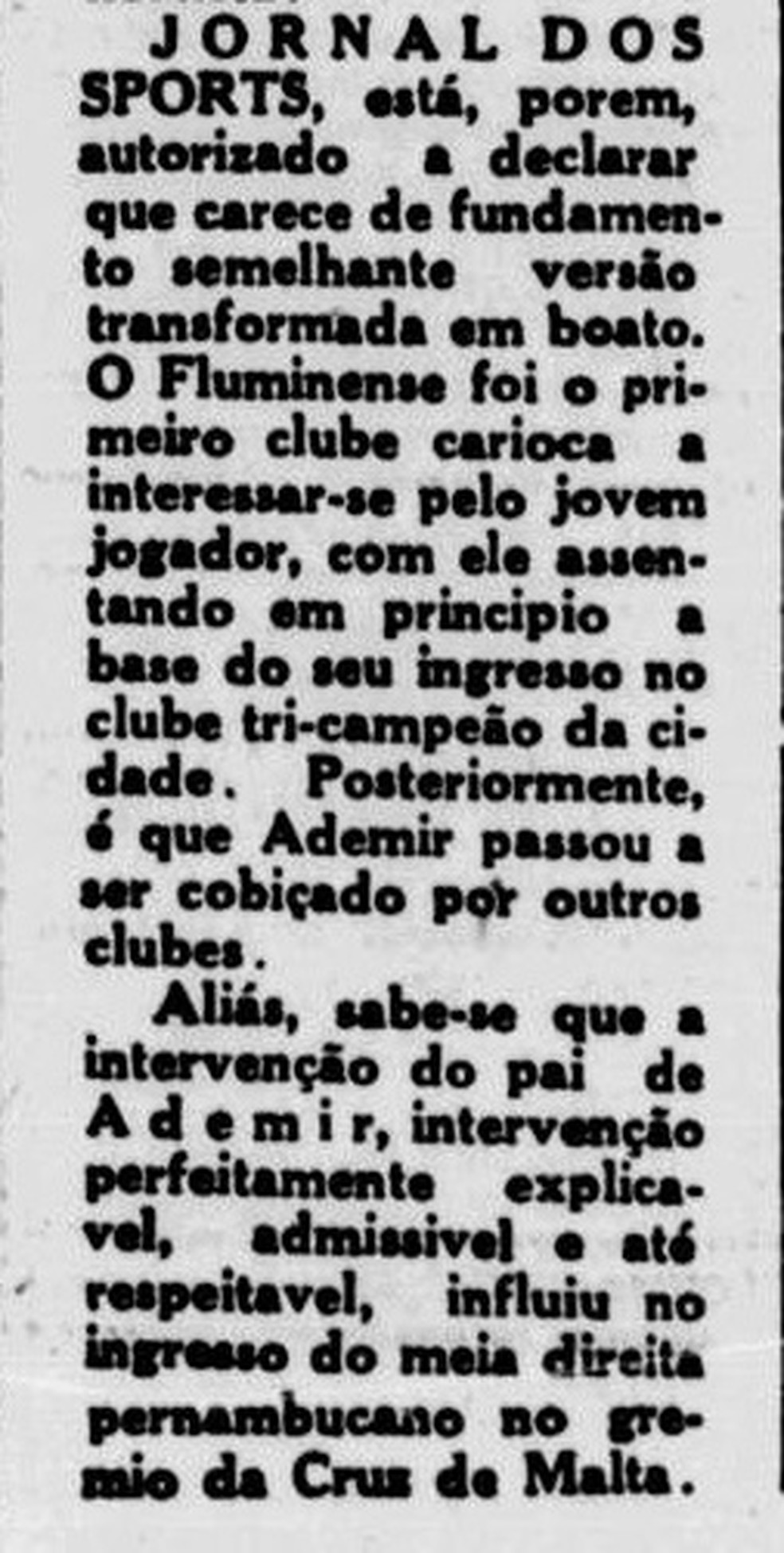 Em 22 de fevereiro, o Jornal dos Sports já trazia a possibilidade de Ademir ficar no Cruzmaltino de vez, deixando a história do Fluminense para depois.