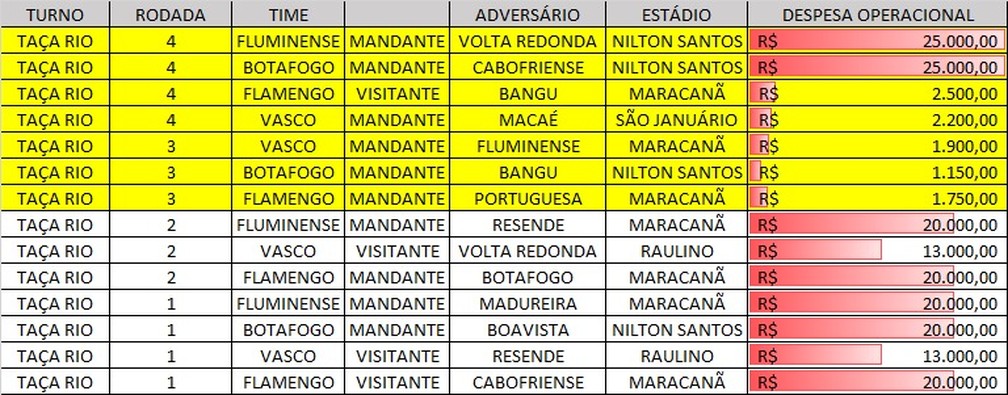 O GloboEsporte.com levantou o quesito "despesas operacionais" de todos os jogos envolvendo os quatro grandes na Taça Rio em 2020. É possível observar que os valores caíram drasticamente desde que as partidas passaram a acontecer com portões fechados por conta da pandemia do novo coronavírus, como ocorreu na 3ª rodada, antes da paralisação das competições. Na 4ª rodada, porém, os valores cobrados a Botafogo e Fluminense foram até maiores do que os cobrados nos jogos com público.