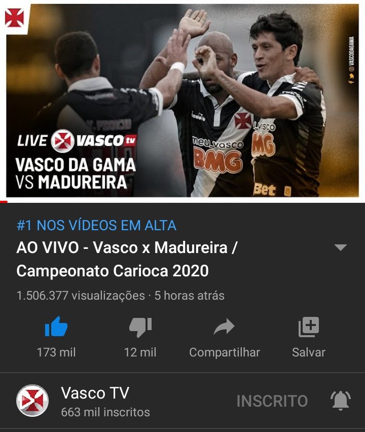 HISTÓRICO! A transmissão feita pela Vasco TV está em 1° lugar nos vídeos 'Em alta' do YouTube.