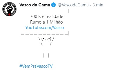 Via Twitter, Vasco celebra marca de 700 mil inscritos no Youtube e lança desafio: 'Rumo a 1 milhão'