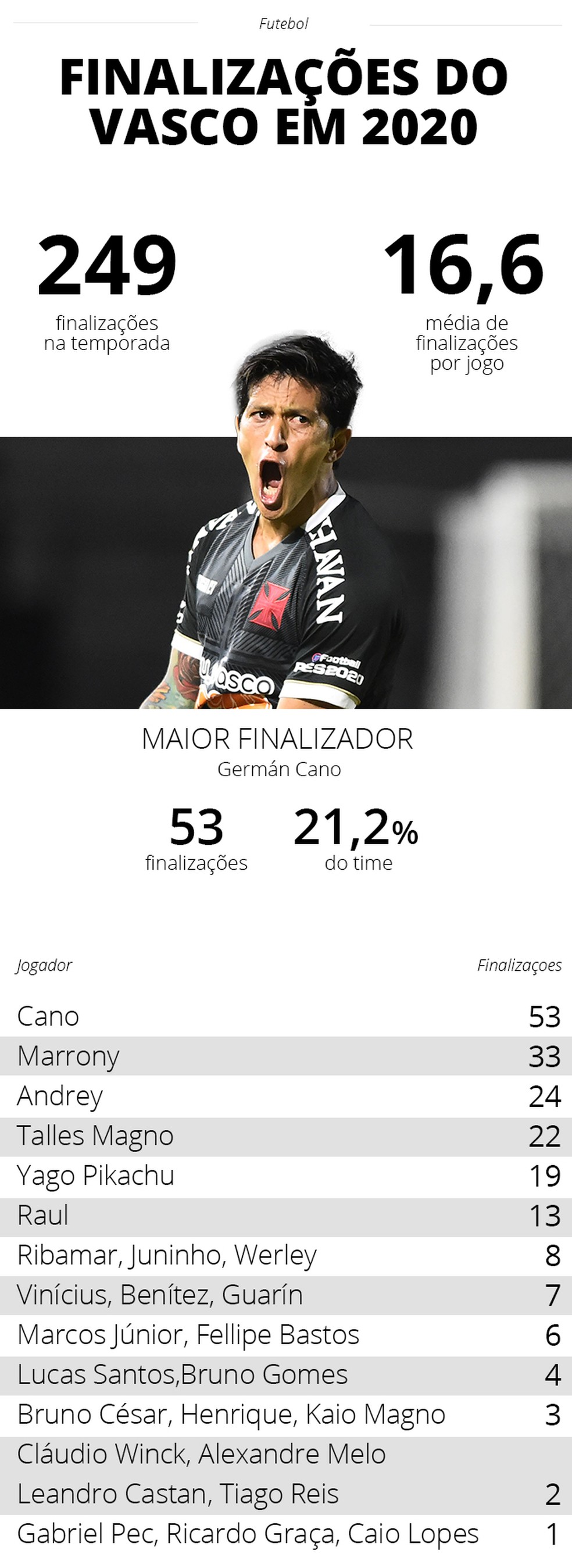 Pela ótima noção de posicionamento, Cano finaliza bastante. É de longe o líder do quesito na Colina, com 53 finalizações no ano. Tal número corresponde a 21,2% do total da equipe (249). É responsável por 75% dos gols do Vasco na temporada (9 de 12). O time, aliás, tem média baixíssima de gols por partida (0,75 - 12 em 16 jogos).