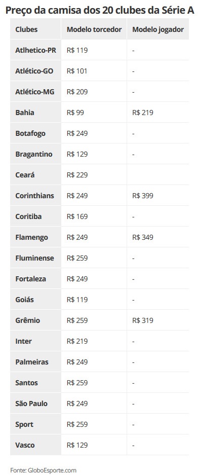A maioria dos clubes tem apenas uma versão de camisa à disposição. Na tabela abaixo, os valores foram alocados na coluna "modelo torcedor".