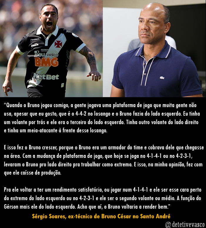 Hoje tive a oportunidade de conversar com o técnico Sérgio Soares, que comandou Bruno César no Santo André, onde o meia surgiu no cenário nacional. Com a nova chance no Vasco, quis saber dele como Bruno poderia ser melhor aproveitado pra voltar a ter o mesmo rendimento inicial.?