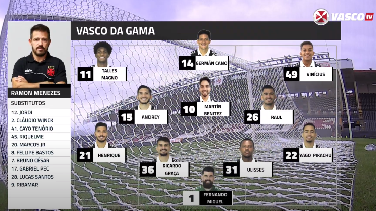 Vasco joga com Fernando Miguel, Pikachu, Ricardo, Ulisses e Henrique; Andrey, Raul e Benítez; Talles, Cano e Vinícius.