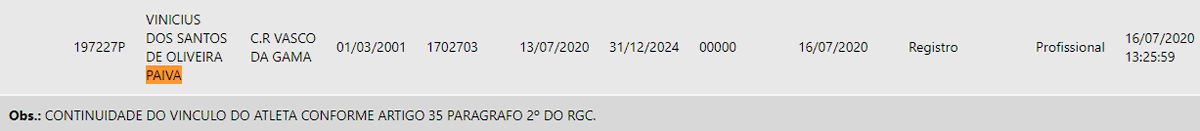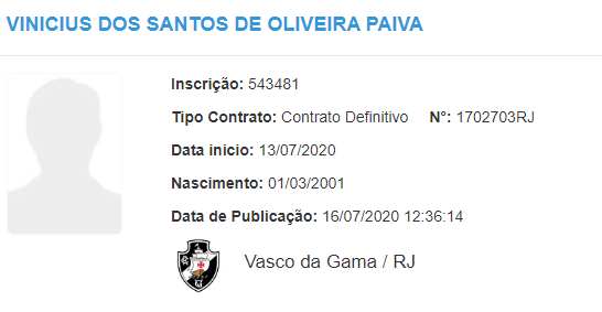 Veja aí que o novo contrato de Vinícius já está registrado no BID (Boletim Informativo Diário) da CBF e no Bira (Boletim Informativo de Registro de Atletas) da Ferj. #gevas