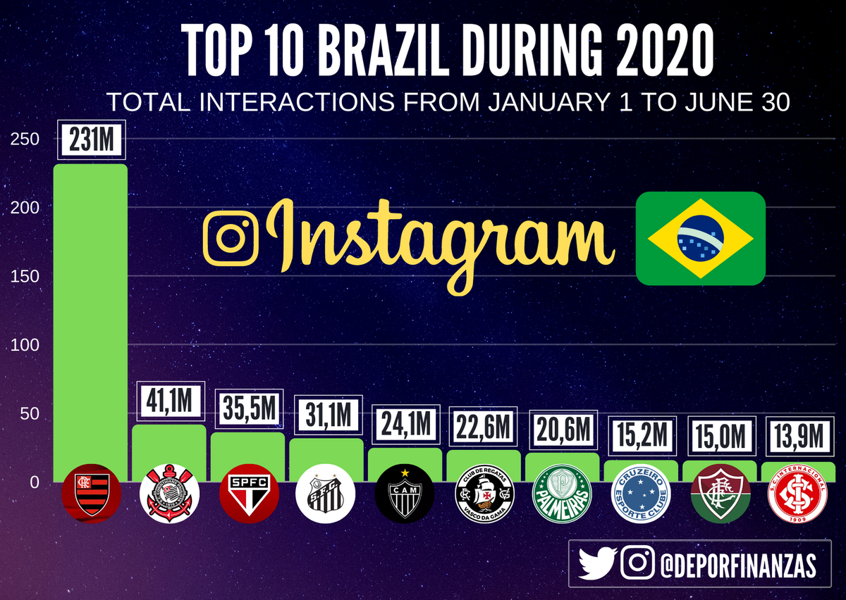 ?⚽?? Os 10 clubes brasileiros com mais engajamento no #instagram durante o 1º semestre de 2020!