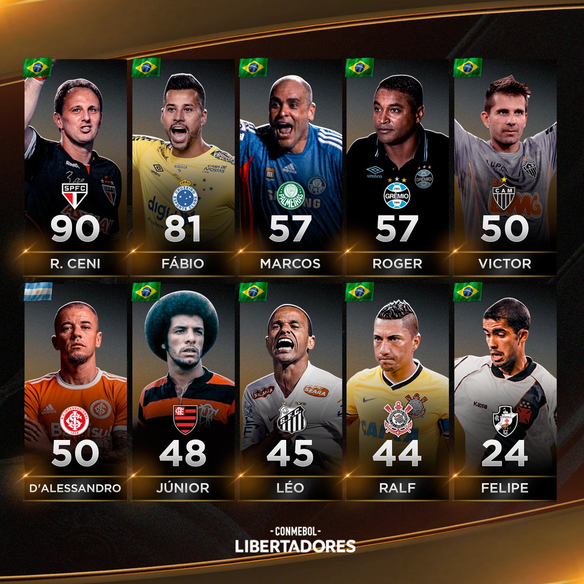 ? Rogério Ceni, do @SaoPauloFC, é o que tem mais jogos e @dale10, do @SCInternacional, o único estrangeiro.