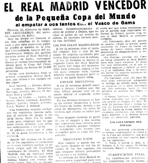 Real e Vasco foram, respectivamente, o 1º e o 2º do Torneio disputado em Caracas. Um dia antes deste amistoso, as equipes haviam disputado a partida final do Torneio, a qual terminou empatada (2 a 2), selando o título madridista. Vavá foi o artilheiro do Torneio com 6 gols.