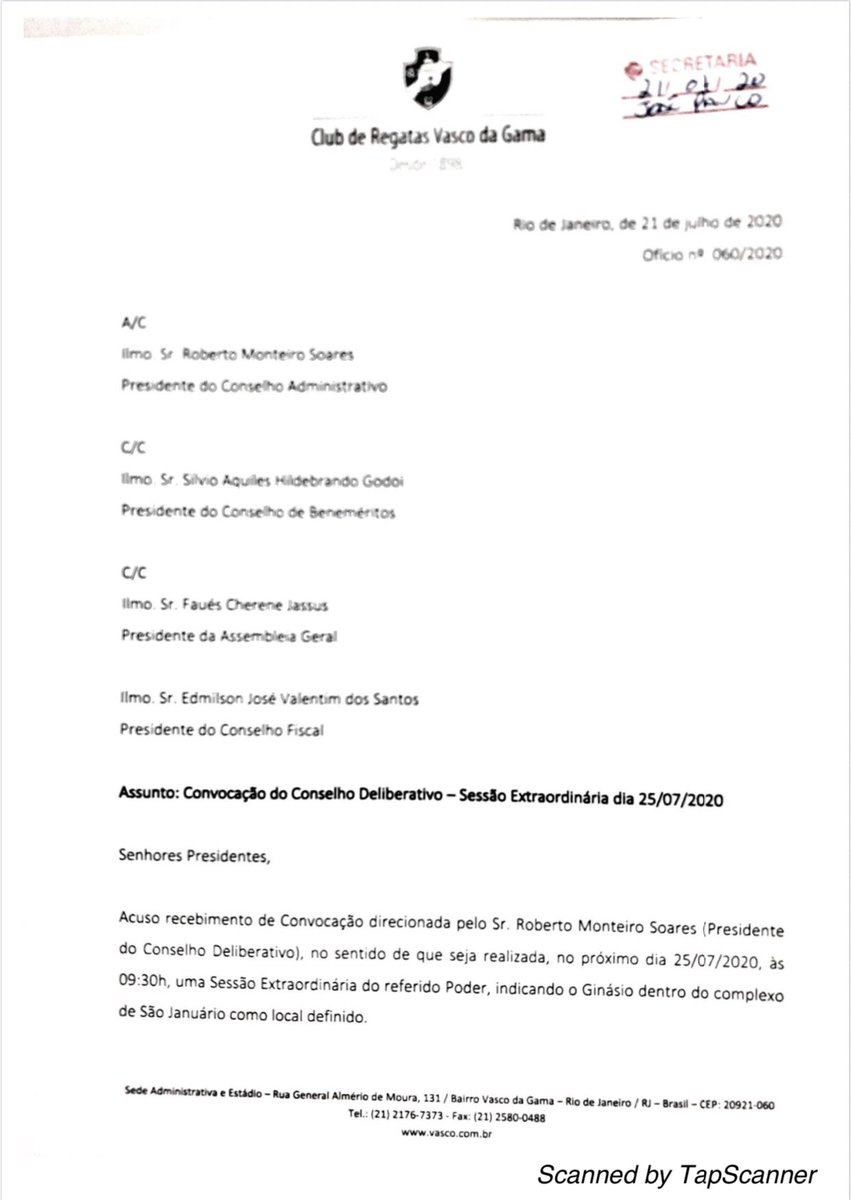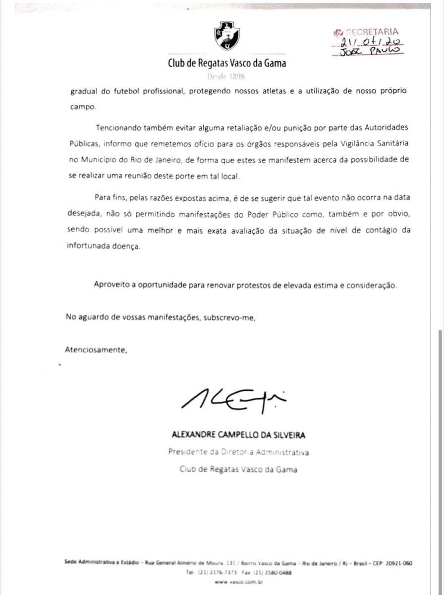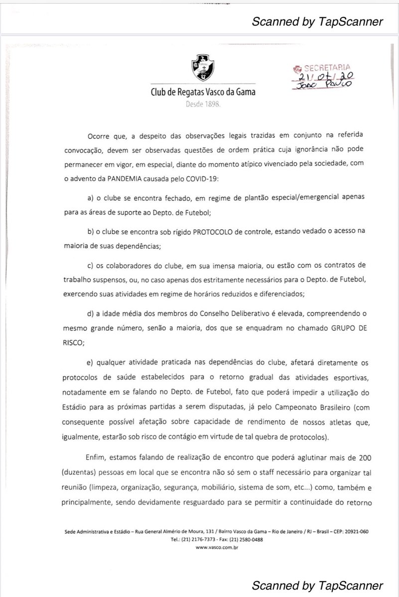 Alegando riscos de saúde relacionados ao Covid-19, o presidente do Vasco, Alexandre Campello, protocolou comunicado sugerindo a não realização da reunião extraordinária do Conselho Deliberativo marcada para este sábado que tem como tema principal a reforma do estatuto