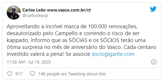 Em uma postagem no Twiiter, Carlos Leão, vice de finanças, abordou o assunto sem dar muitos detalhes: