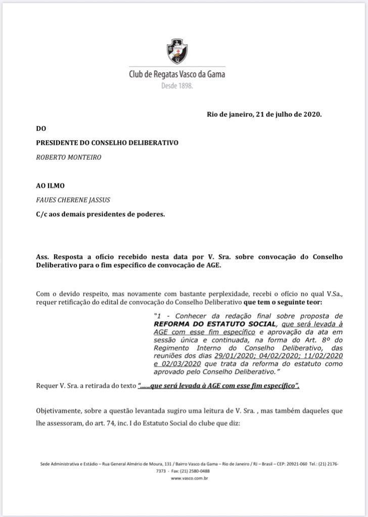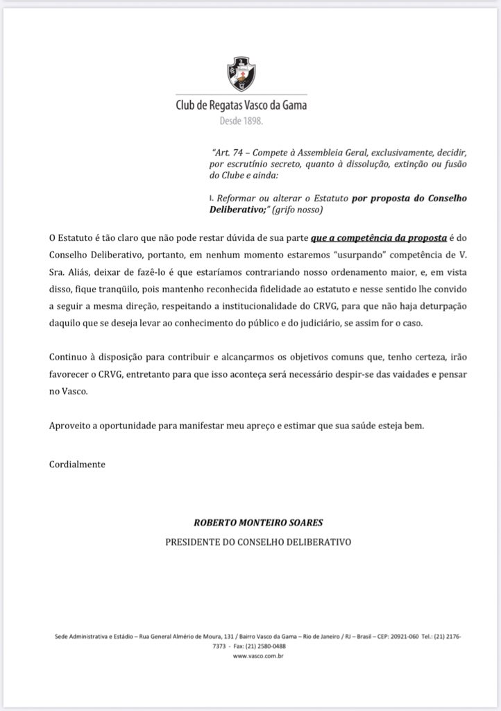 Nele, o presidente do CD cita o artigo 74, inciso I, para dizer que "a competência da proposta é do Conselho Deliberativo"