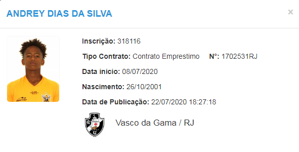 Andrey registrado no BID pelo Vasco. O meia de 18 anos assinou contrato com o clube na última semana. Chega emprestado pelo Nova Iguaçu até junho de 2021 com valor de passe fixado.