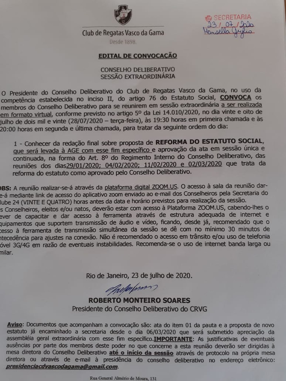 Roberto Monteiro, presidente do Conselho Deliberativo, convocou reunião virtual para, na próxima terça-feira, dia 28 de julho, votar a aprovação da ata da reforma estatutária do Vasco. O chamado (veja o documento abaixo) ocorreu um dia depois de a Secretaria de Municipal de Saúde vetar a sessão presencial que o dirigente pretendia realizar, sábado, em São Januário.