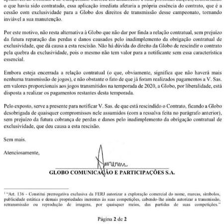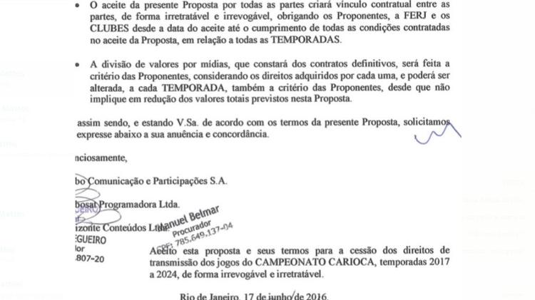 "O aceite da presente proposta por todas as partes criará vínculo contratual entre as partes, de forma irretratável e irrevogável, obrigando os proponentes, a Ferj e os clubes desde a data do aceite até o cumprimento de todas as condições contratadas no aceite da proposta, em relação a todas as temporadas", diz o trecho do documento. "Aceito esta proposta e seus termos para a cessão dos direitos de transmissão dos jogos do Campeonato Carioca, temporadas 2017 a 2024, de forma irrevogável e irretratável", finaliza o contrato assinado por Globo, Federação e clubes em 17 de junho de 2016.