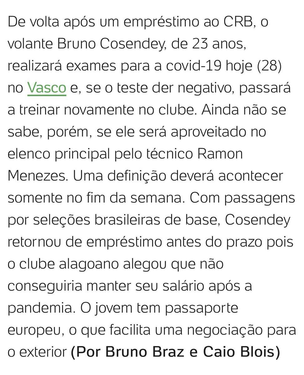 Bruno Cosendey fará exames de Covid-19 nesta 3ª antes de se apresentar ao Vasco