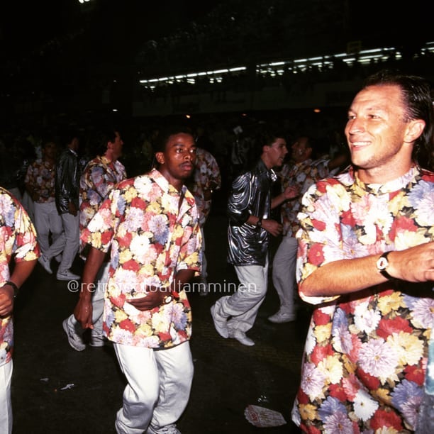 Dener e Alcindo desfilando na ala de jogadores de futebol da Beija-Flor de Nilópolis no carnaval de 1994. Já era madrugada da terça, 15 de fevereiro. Ninguém podia imaginar que esse garoto, cheia de vida e com um futuro brilhante, naquele momento tinha apenas dois meses e um par de dias de vida pela frente. #dener #alcindo #beijaflor #carnaval1994