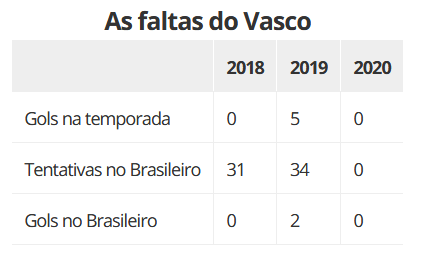 Desde 2015, o ge monitora as cobranças de faltas no futebol brasileiro. No caso do Vasco, o time marcou 18 vezes no período, e o ex-zagueiro Rodrigo é quem mais balançou a rede, em seis oportunidades.