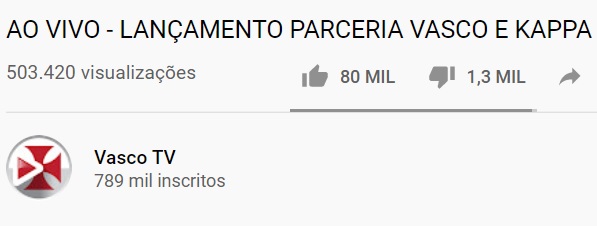 Finalizado há cerca de 5 horas, o vídeo da VascoTV da live de apresentação da nova coleção Vasco/Kappa já tem mais de 500 mil visualizações no Youtube.