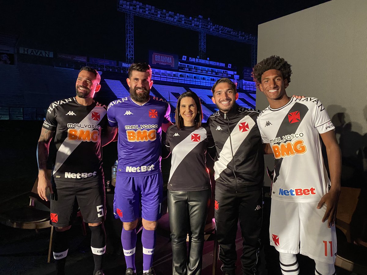 Vanessa Riche, apresentadora da live de lançamento da nova coleção, posta foto com os 'modelos' do Vasco