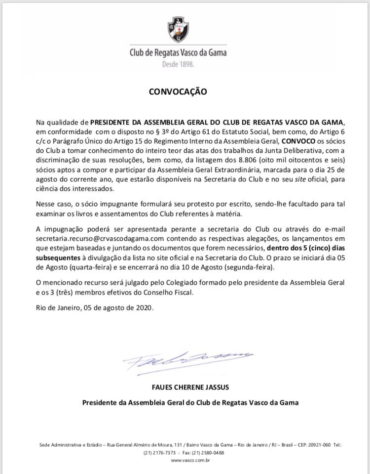 Mussa informa que 8.806 sócios estão aptos a votar e abre prazo para impugnações