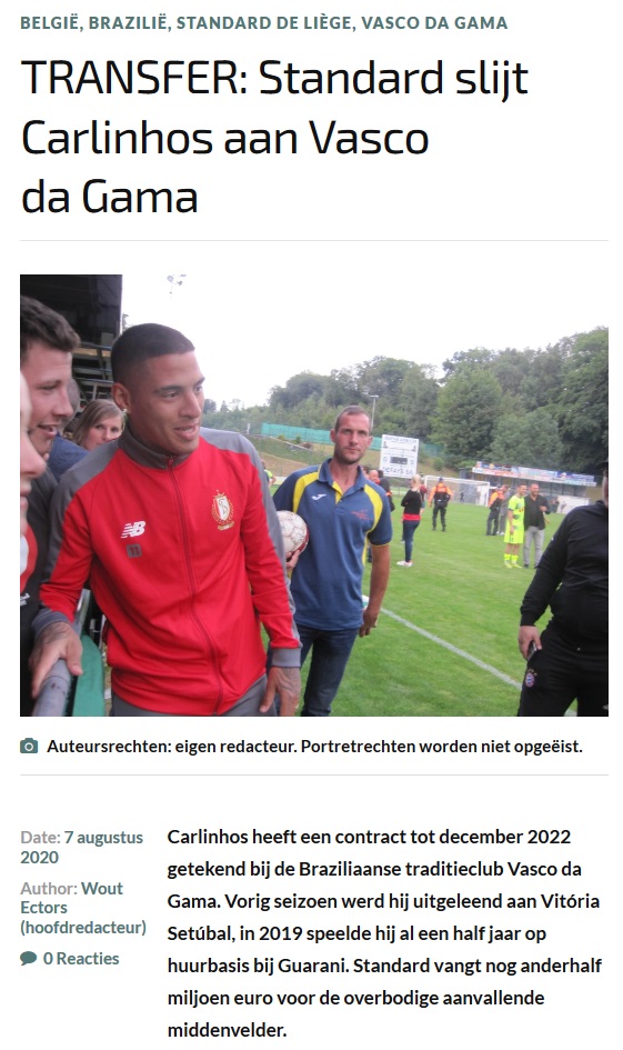Mídia belga diz que Standard de Liège recebeu 1,5 milhão de euros por Carlinhos