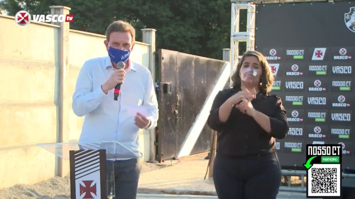 Prefeito Marcelo Crivella discursa para os presentes na cerimônia de hasteamento da bandeira no novo centro de treinamento do Vasco.