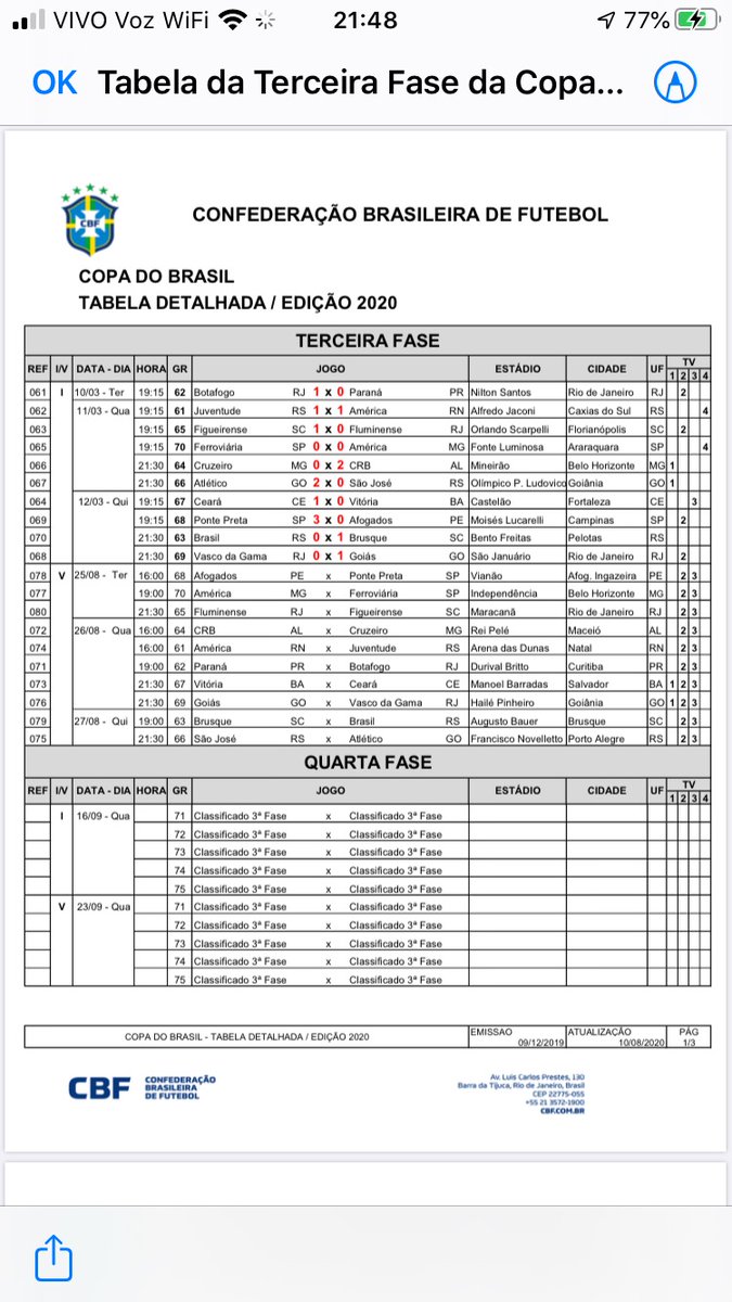 Tabela da terceira fase da Copa do Brasil. #Itatiaia