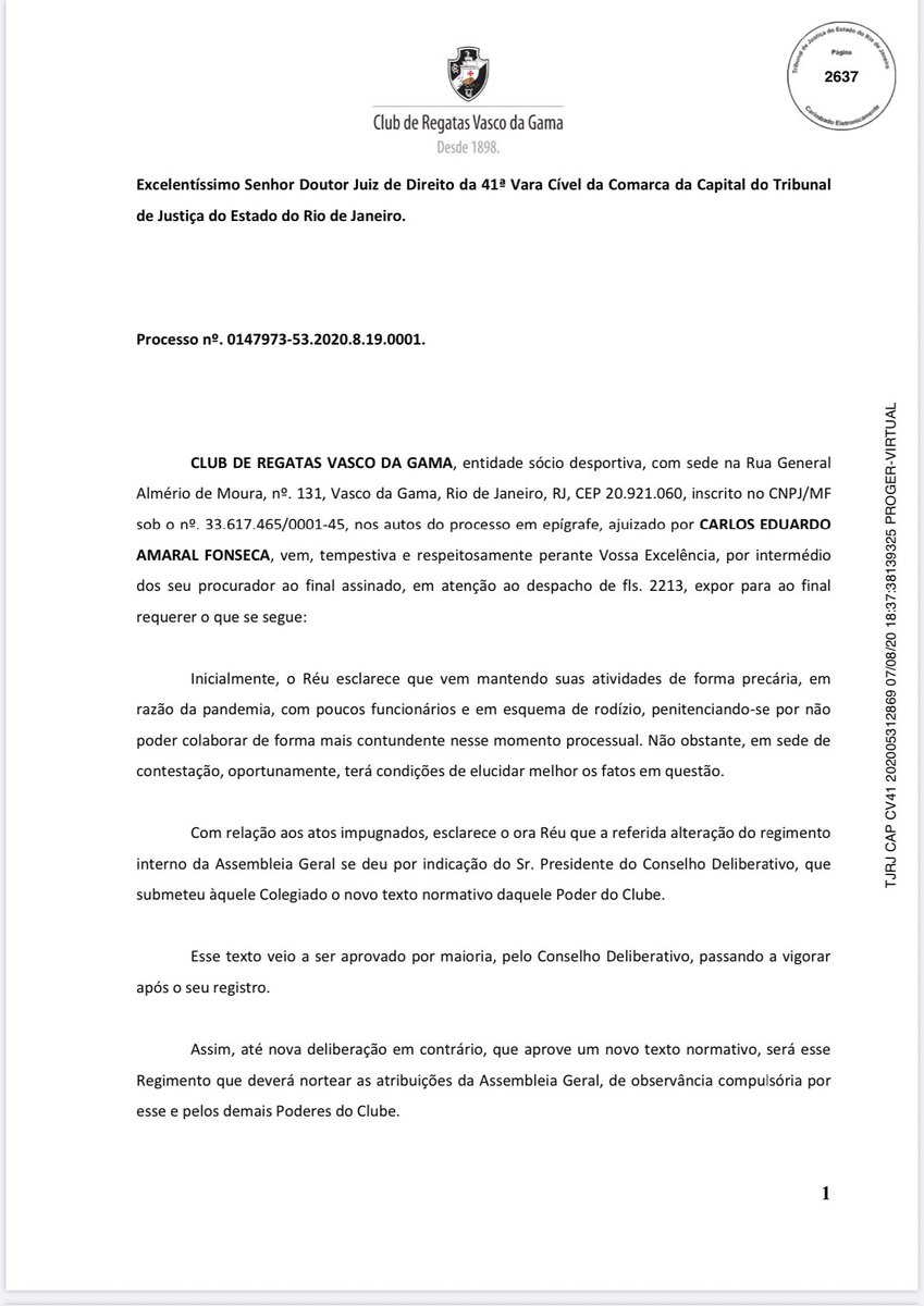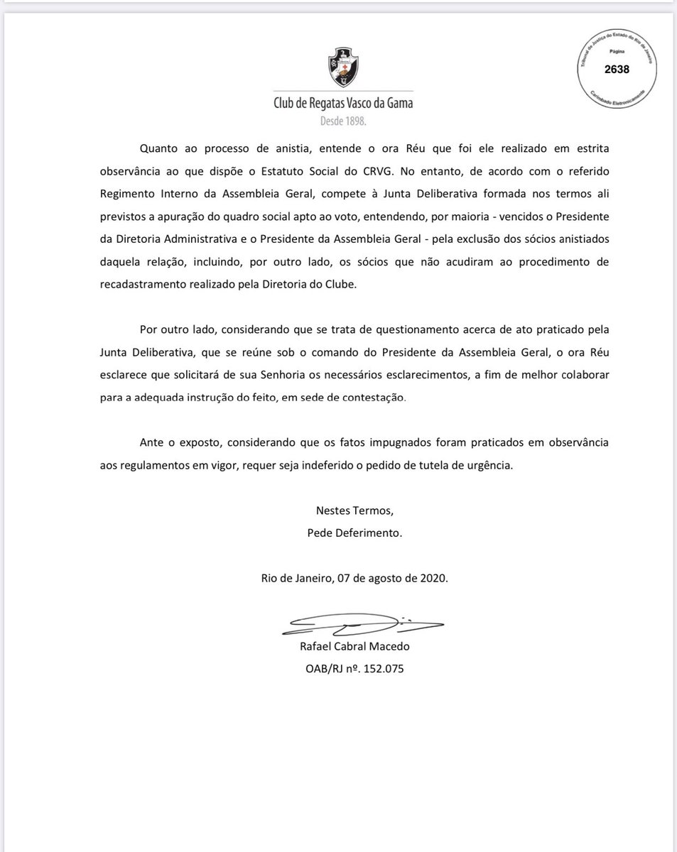 Na última sexta, o Vasco havia se manifestado à Justiça pedindo o indeferimento da liminar que hoje foi concedida e anulou as decisões da Junta Deliberativa