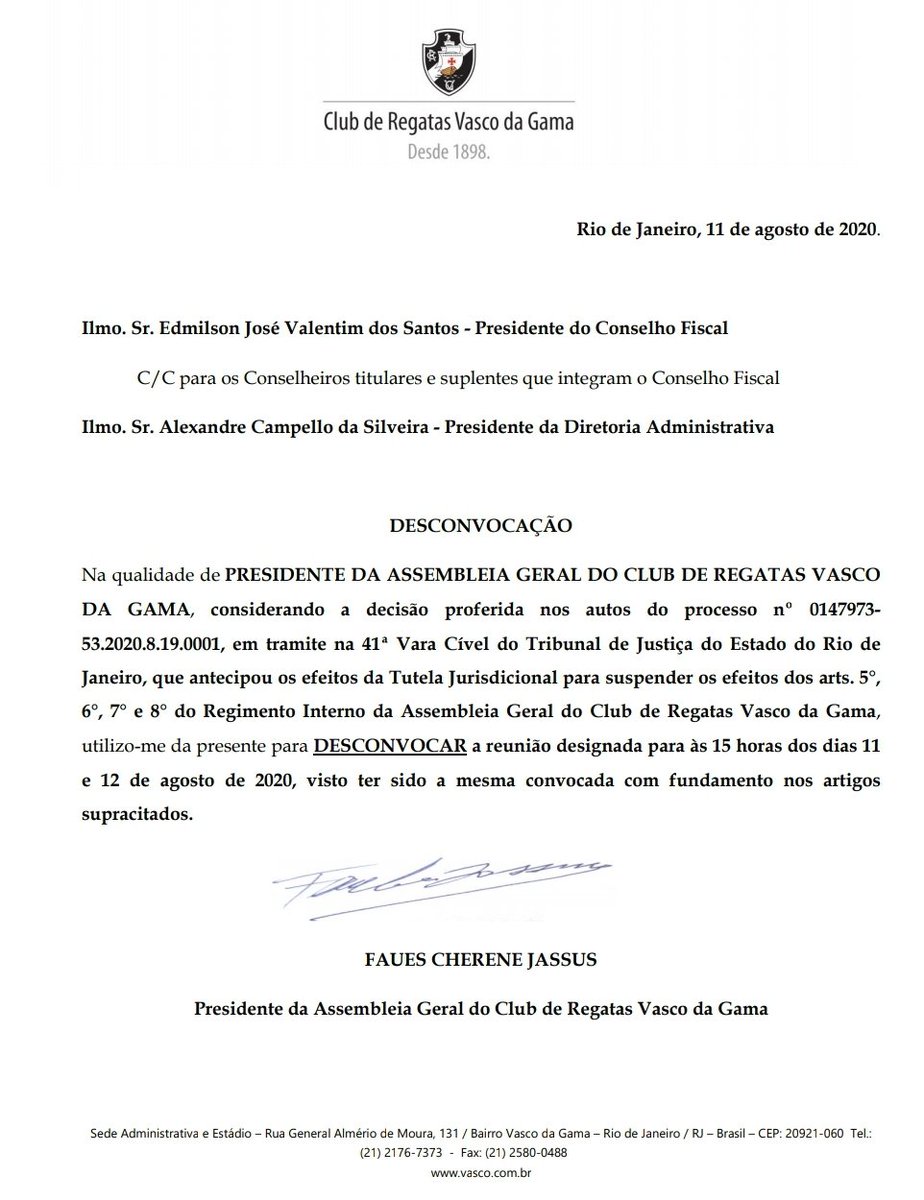 Mussa, presidente da Assembleia Geral do Vasco, desconvocou há poucos minutos a reunião da Junta, atendendo a liminar concedida ontem pelo Tribunal de Justiça do Estado do Rio de Janeiro. Espiem #VascoENM