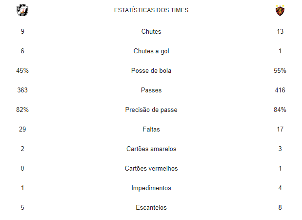 O panorama da partida seguiu até os minutos finais. Somente aos 40 minutos, os visitantes acertaram a trave, em cabeceio de Bruninho. Só que o Vasco conseguiu manter a vantagem para sair de campo com a vitória em São Januário.