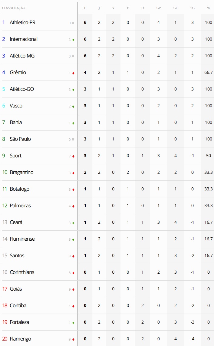 Mesmo com um jogo a menos do que a maioria dos participantes do Campeonato Brasileiro, o Vasco está em 6º lugar na classificação após 2 rodadas.