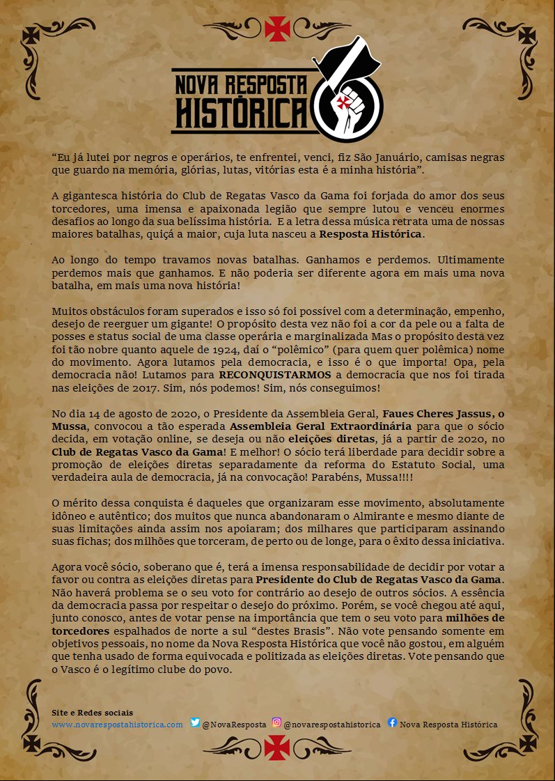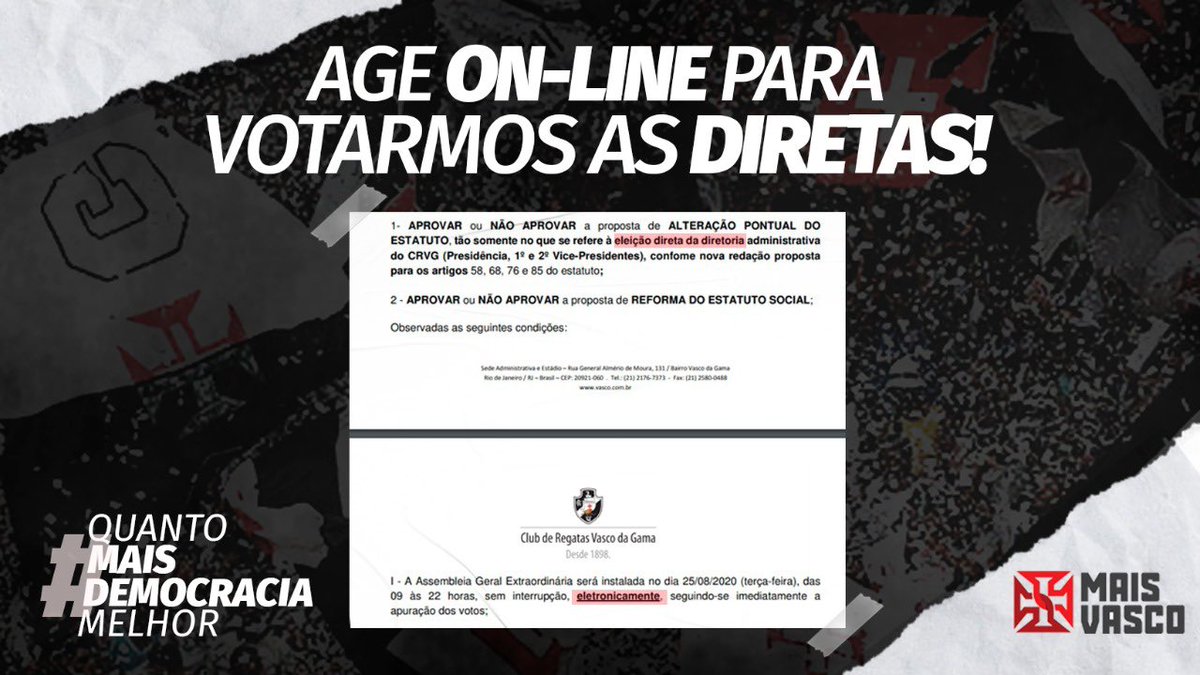 Uma vitória para a democracia. Uma vitória para o Vasco. Uma vitória para a torcida vascaína. Diretas separadas do estatuto e votação on-line na AGE. Uma vitória de todos nós.