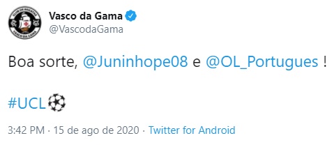Via Twitter, Vasco deseja boa sorte a Juninho Pernambucano e ao Lyon na Champions