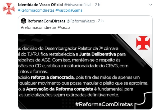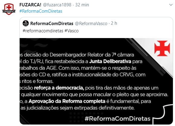 Identidade Vasco e Fuzarca republicam nota do Reforma Com Diretas sobre nova decisão judicial sobre AGE