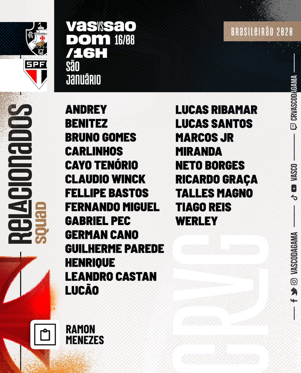 Confira os relacionados do Vasco para o jogo contra o São Paulo; Neto Borges é a novidade