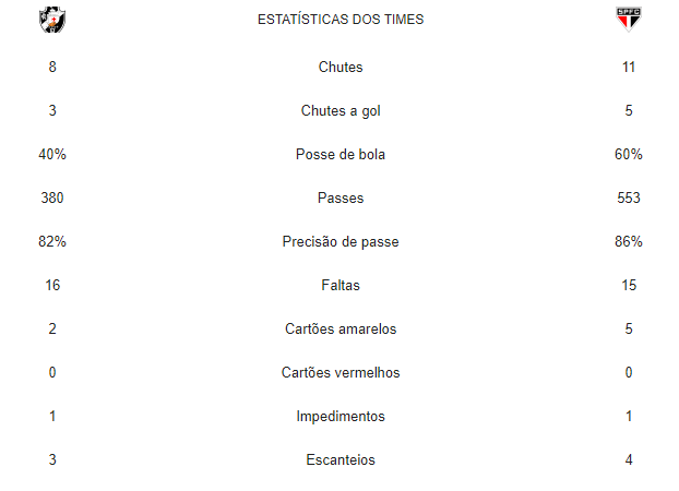 Cartões amarelos: Bruno Gomes, Cayo Tenório (Vasco); Igor Gomes, Liziero, Pablo, Fernando Diniz, Arboleda, Reinaldo (São Paulo)