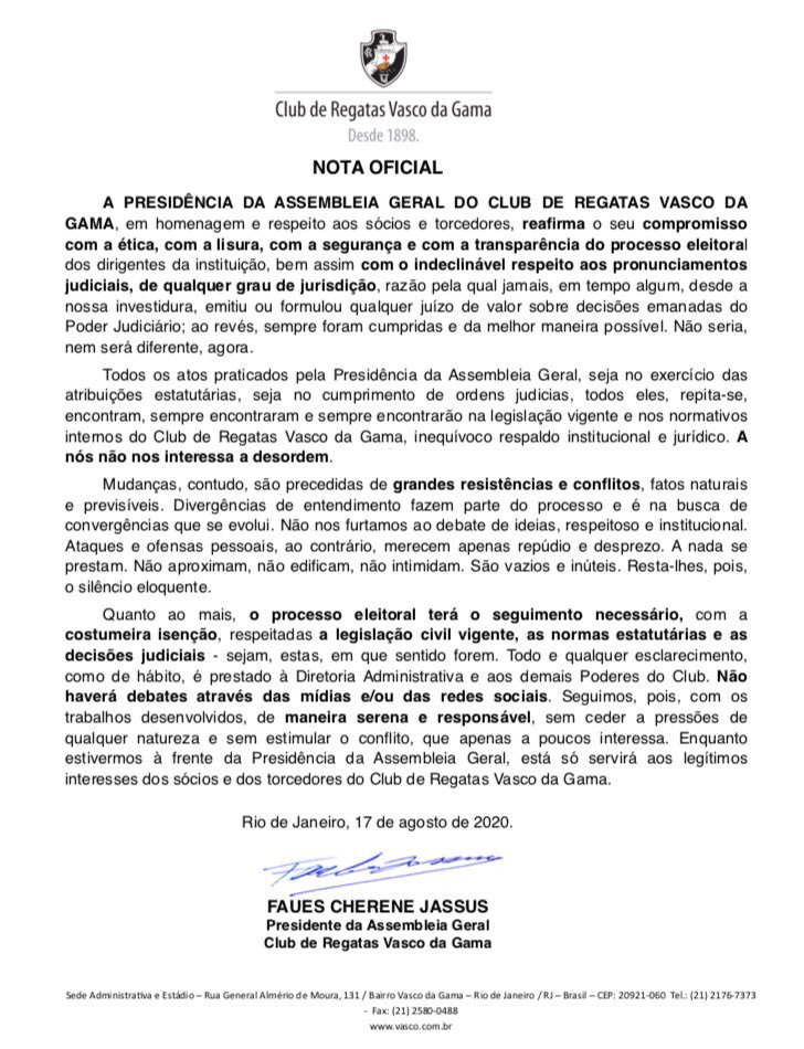 Presidente da Assembleia Geral, Mussa emite nota sobre o processo eleitoral do Vasco