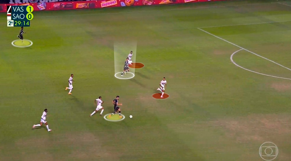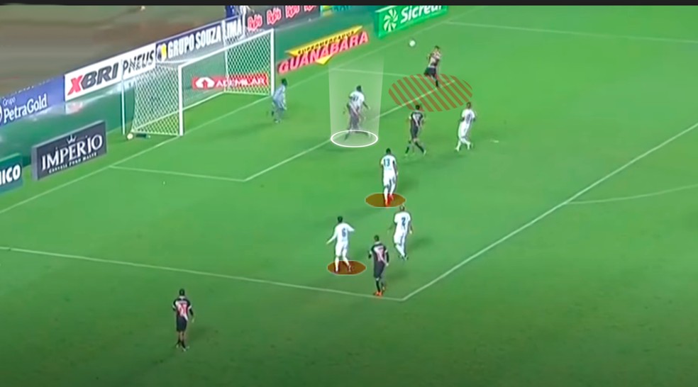 Esse espaço é muito pequeno e difícil de ser notado. No gol que fez contra o São Paulo, Cano corre junto com Andrey, que puxa o contra-ataque. Ele gira o pescoço e olha para Talles Magno. Ele sabe que Arboleda está totalmente focado em diminuir seu raio de ação, e que só há um espaço disponível para preencher quando o Vasco chegar na área: as costas de Arboleda.