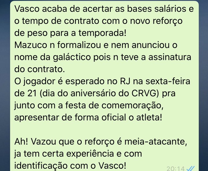 Está rolando este texto em vários em grupos de WhatsApp de vascaínos e criando a falsa expectativa. O nome do Alex Teixeira foi associado ao possível reforço. Alex Teixeira não é e tem mais! O presente que sei é a apresentação do contrato de reforma de São Januário! Aguardemos 6ª